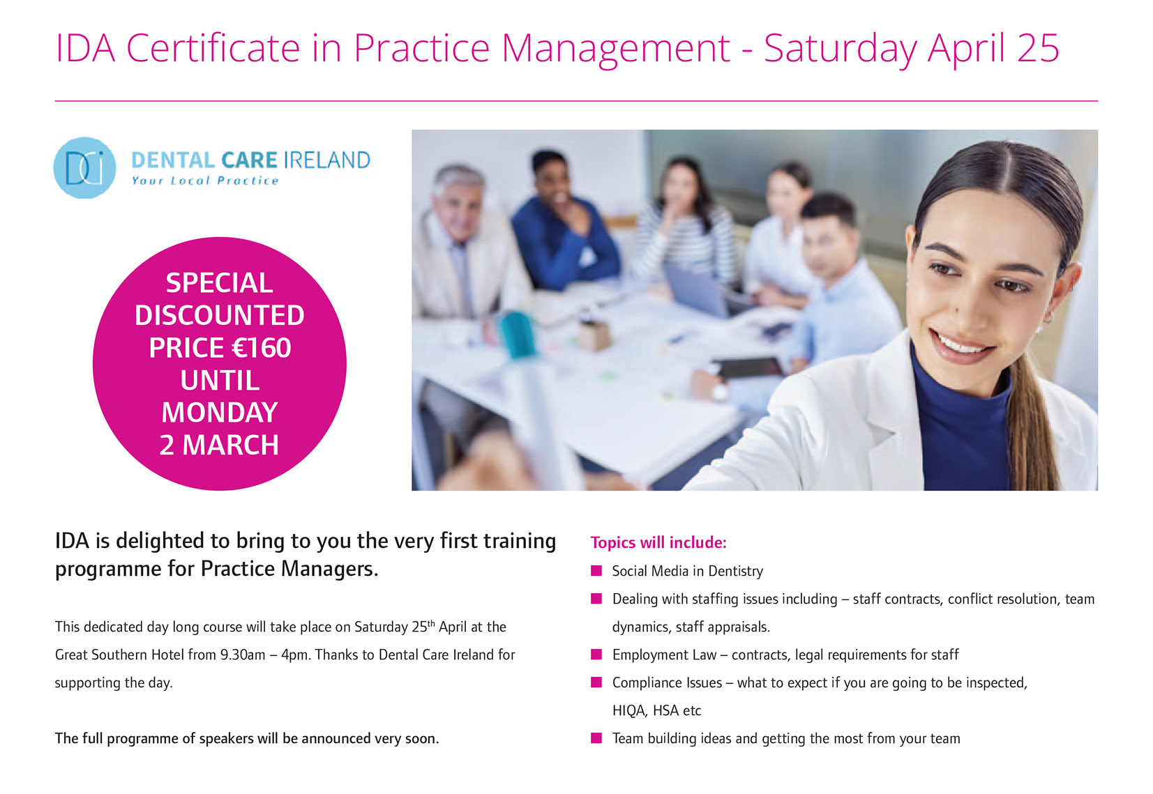 All cancellations must be received in writing either by email, or by post to IDA House, Unit 2 Leopardstown Office Park, Sandyford, Dublin 18. Cancellations received 29 days or more prior to the course/event will be entitled to a 100% refund. Cancellations received between 15 days and 28 days (inclusive) prior to the course/event will receive a 75% refund. For cancellations received between 1 day and 14 days (inclusive) prior to the course/event, no refund will be given. Failure to attend the course/event on the day will constitute late cancellation and no refund will be given. Substitutions are welcome at any time. Due to unforeseen circumstances, the programme may change and the IDA reserves the right to cancel the event or alter the venue and/or speakers.